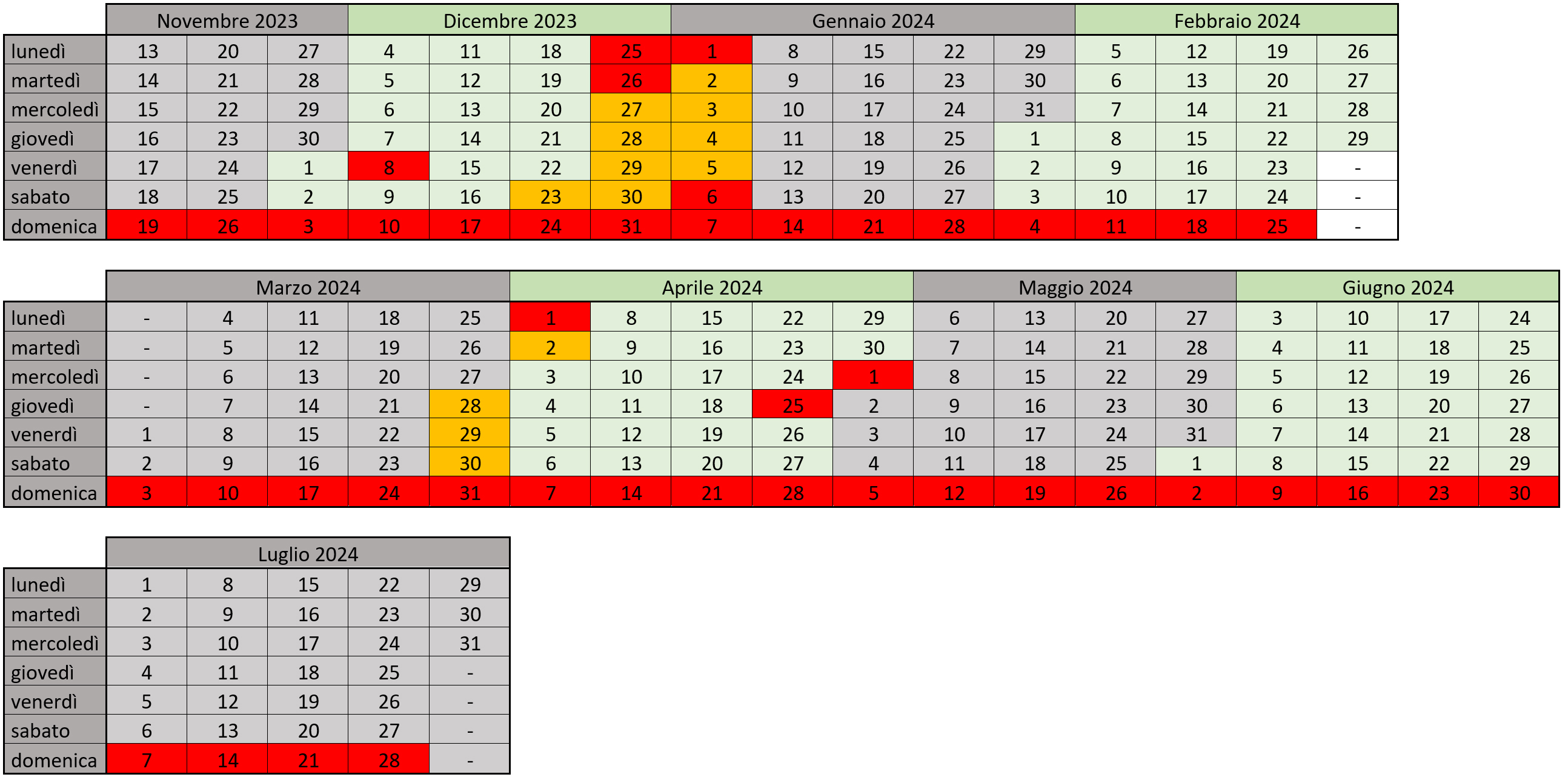 Arancione: giorni in cui รจ possibile recuperare lezioni o aggiungere lezioni in accordo tra docenti e allievi.